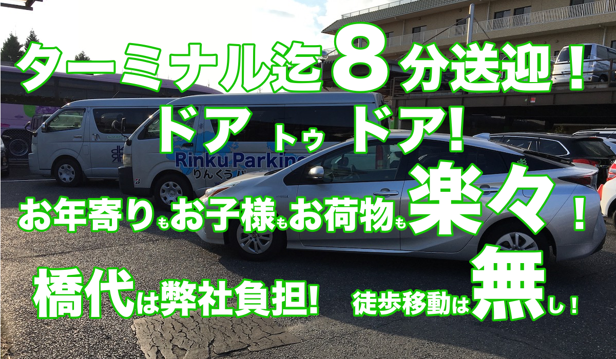 | 徒歩移動はあるか? | りんくうパーキングからターミナル迄8分送迎 (ハイエース/プリウス)徒歩は無し! ドア・トゥ・ドア |
